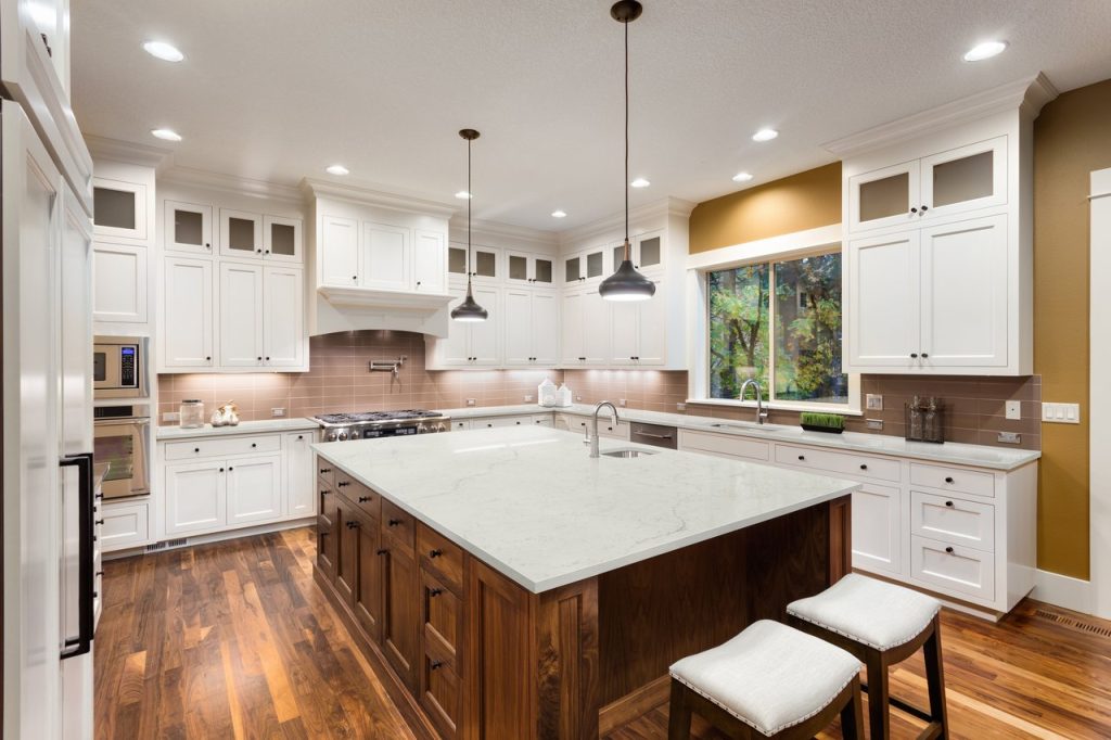 Sleek and luxurious, Calacatta Lavasa Quartz features a warm white background.