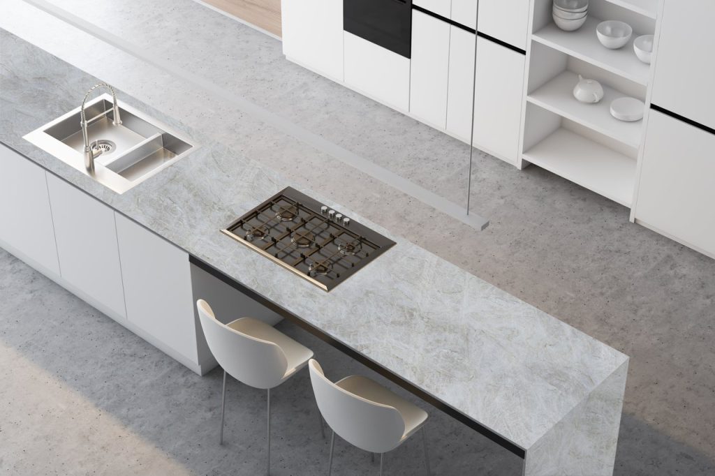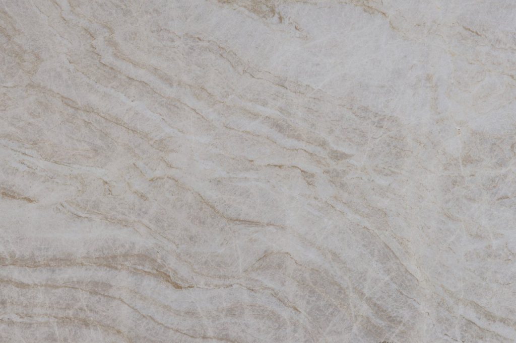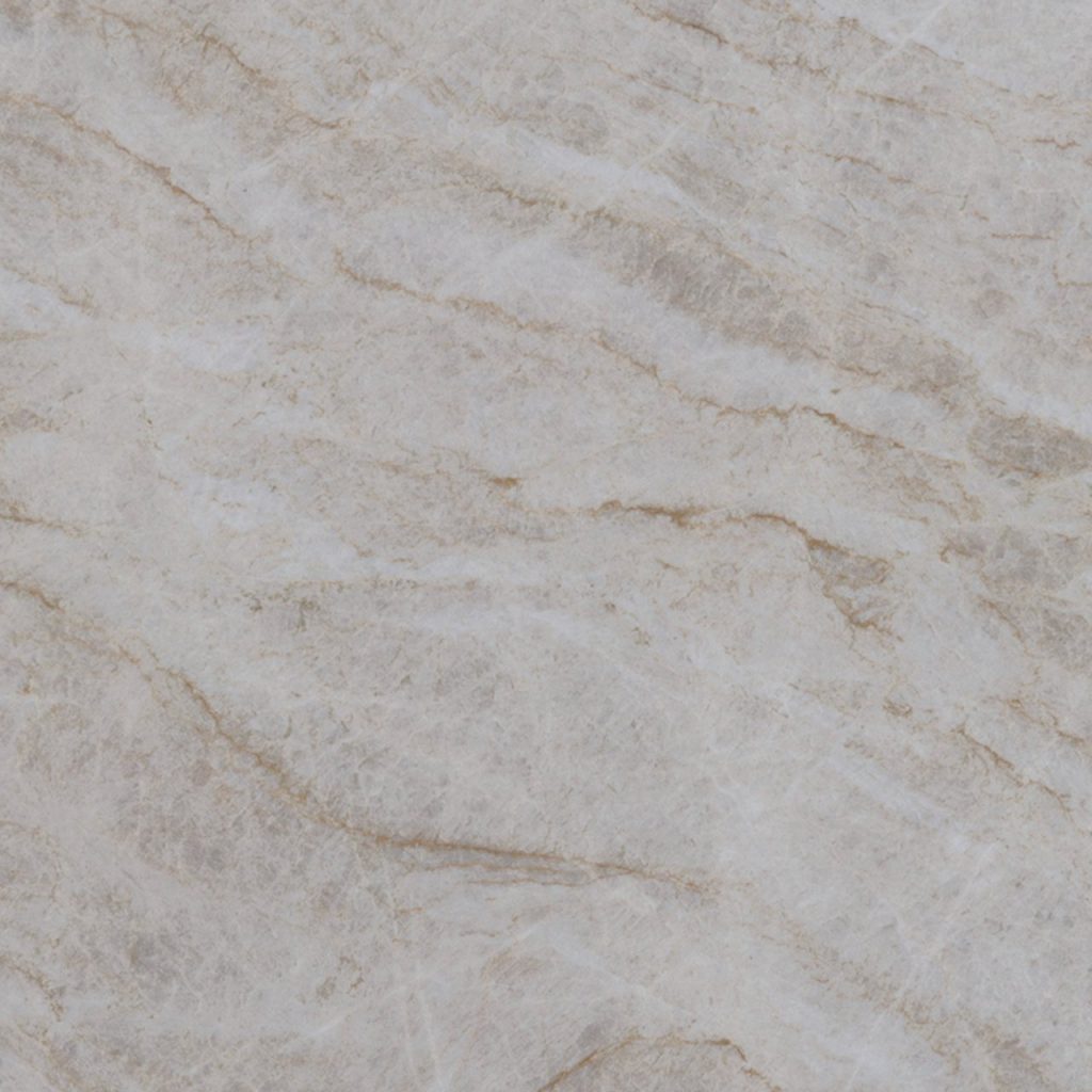 Taj Mahal Quartzite features a soft white background and subtle gold veins.